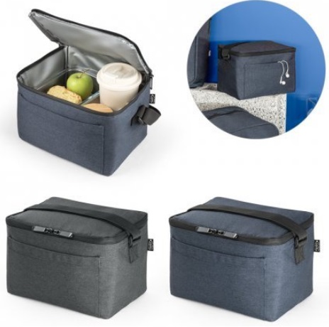 Bolsa térmica em rPET 600D com interior em PEVA. Alça ajustável em webbing, bolso frontal e fecho duplo. Capacidade até 7 L. 240 x 170 x 170 mm